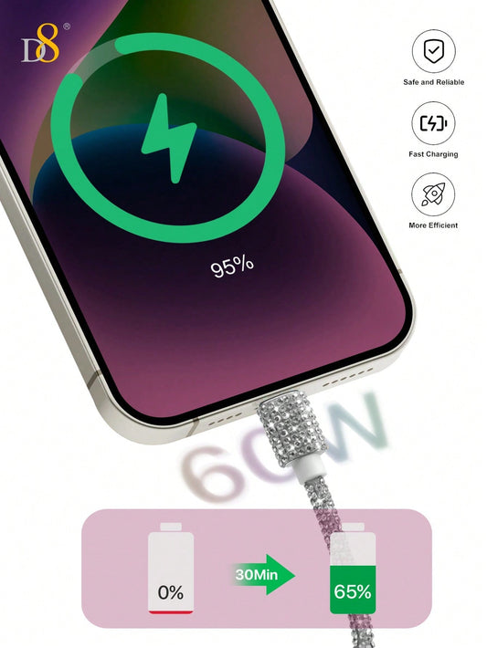D8 USB-C to USB-C Cable – 60W Fast Charging, Crystal Rhinestone Design for iPhone, Galaxy, Pixel