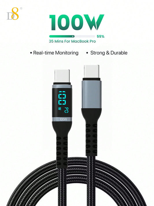 D8 USB-C to USB-C Cable – 1.2M, 100W PD Fast Charging with LED Display for iPhone, iPad, Galaxy