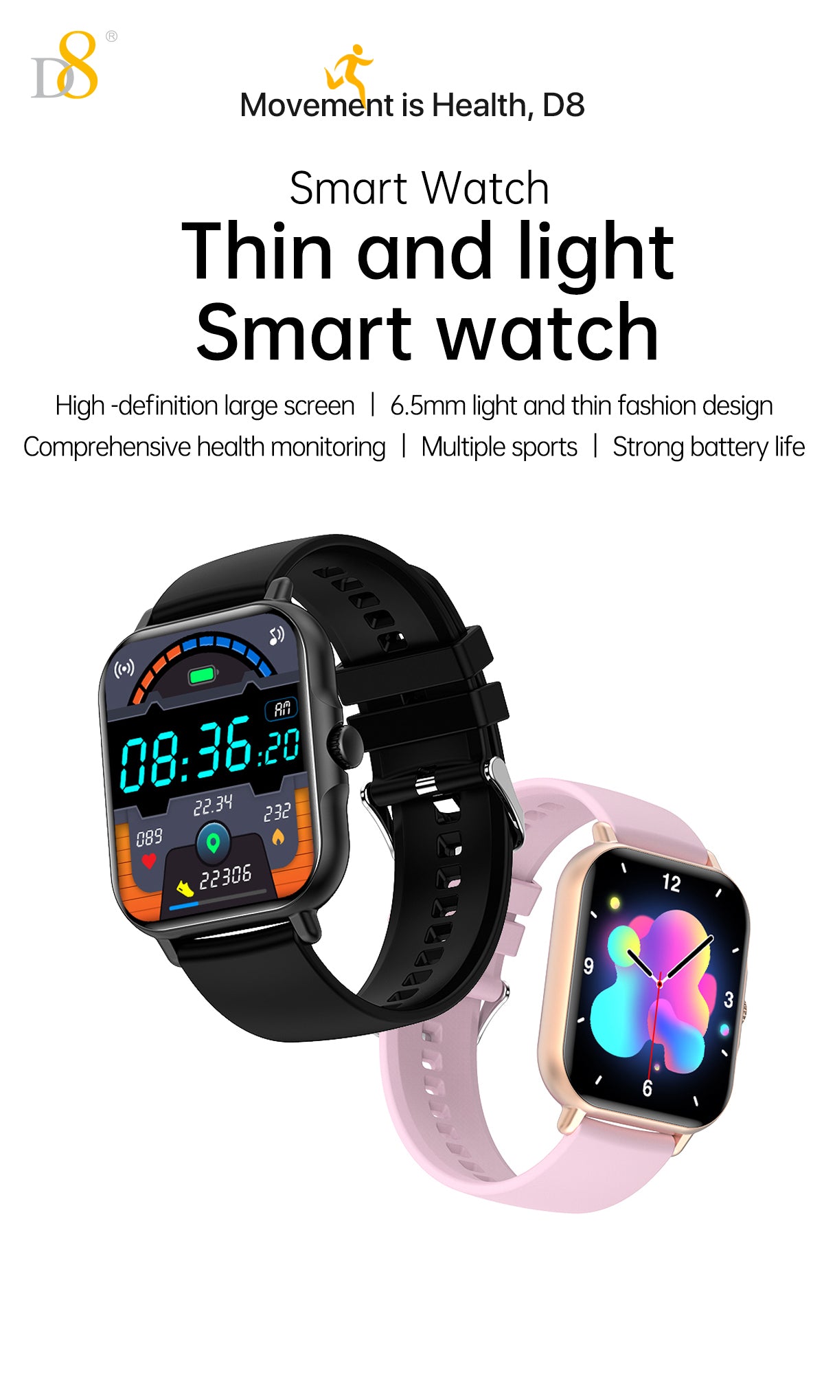 - Comprehensive Health Tracking: With features like heart rate monitoring, blood pressure measurement, and sleep tracking, the D8UP3 helps you keep a close eye on your health.